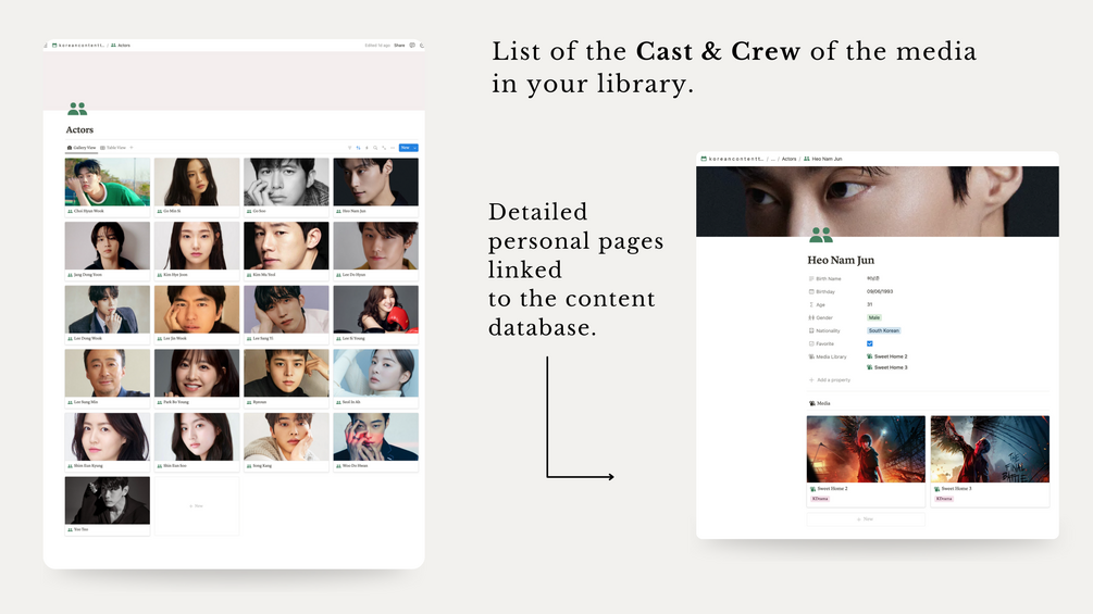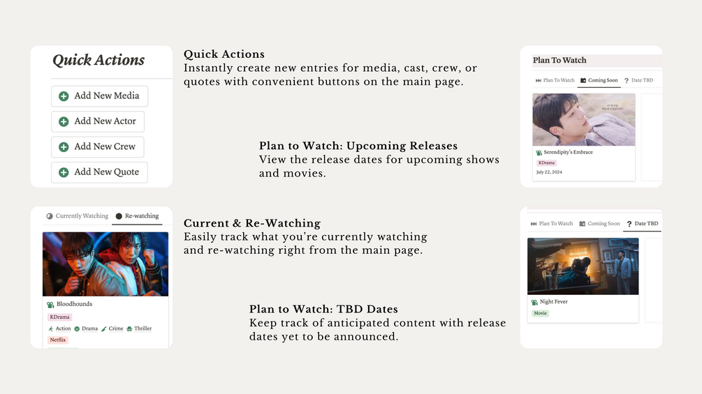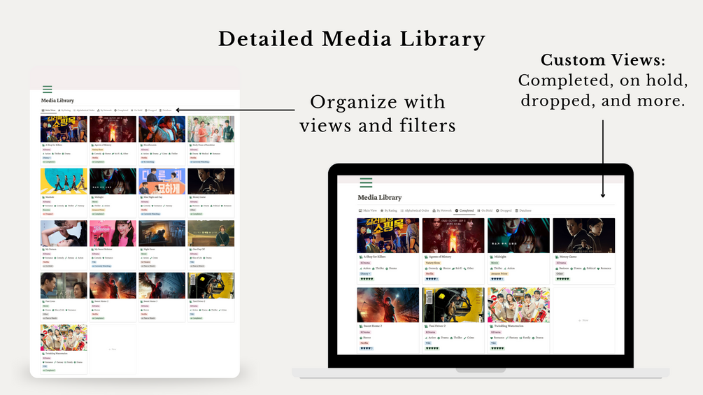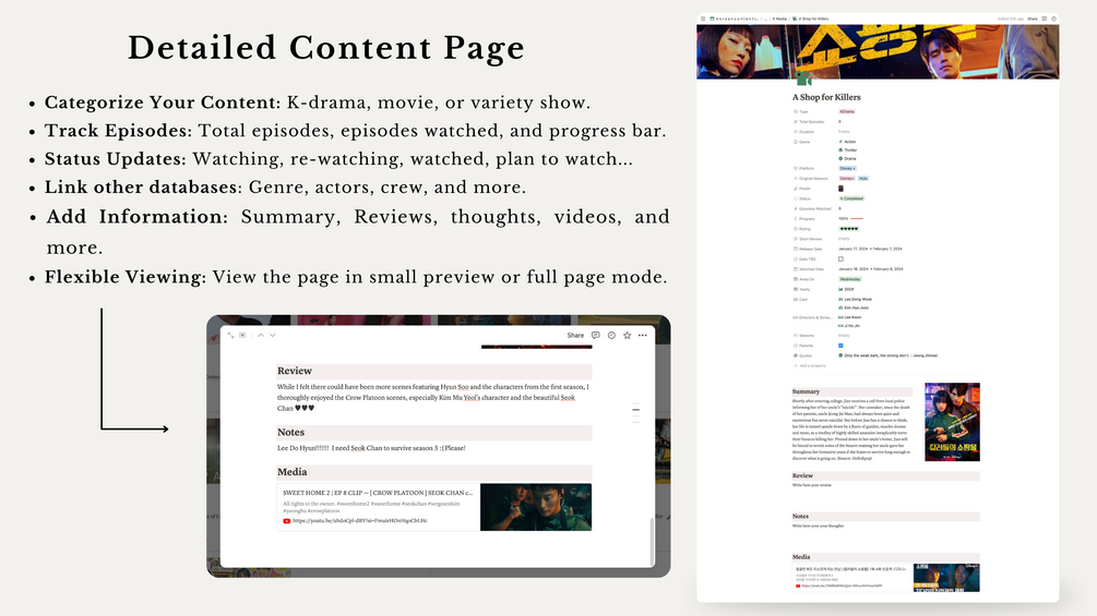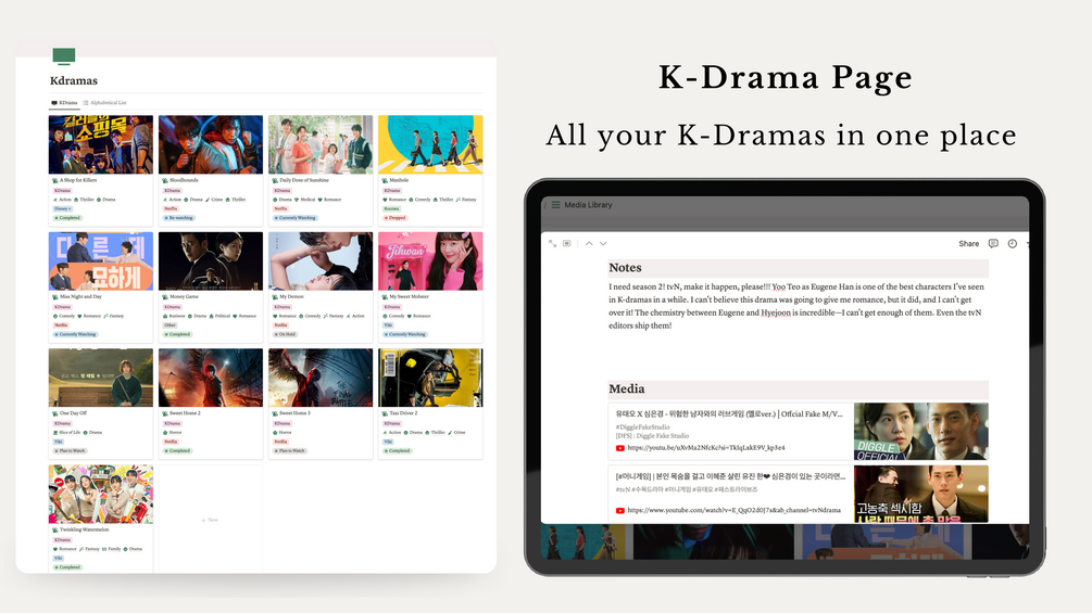 - Copyright: Please note that the Notion template you will receive does not include the actual Kdramas or movies shown in the promotional photos or tutorial videos due to copyright restrictions. The examples provided in the final template are fictional. Additionally, there are only a few examples, making it easier for you to quickly delete them and add your own content.