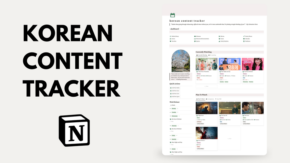 Introducing the Ultimate Korean Content Tracker! Perfect for tracking your favorite Korean dramas, movies, and variety shows. This customizable Notion template helps you stay organized, manage your watchlist, and keep up with your watching progress.